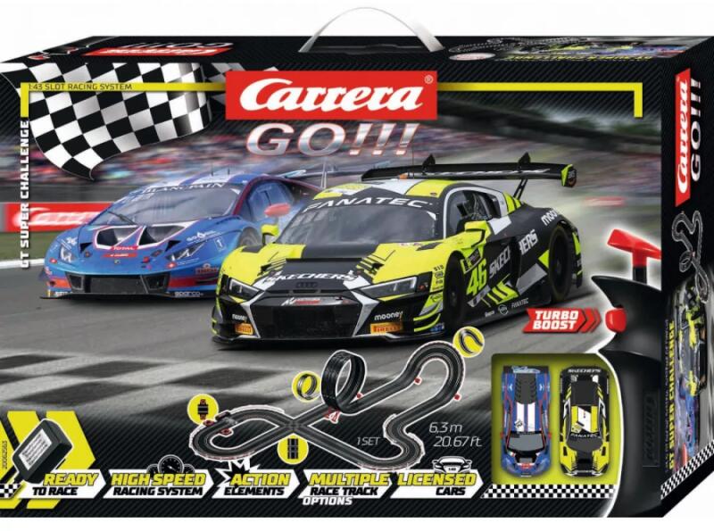 Carrera GO 62563 GT Super Challenge versenypálya szett6,3 m hosszú Carrera GO!!! pálya, Audi R8 LMS GT3 és Lamborghini Huracán GT3 autókkal, tartalmaz hurkot , elágazást, egyeneseket, kanyarokat, merőleges kanyart, körszámlálót és egyéb részeket. Más különböző pályákat is építhetsz a fantáziád szerint. Pálya hossza : 6,3 m Méretek összeszerelés után: 175 x 122 cmA csomag tartalma:- 1x Audi R8 LMS GT3 evo II "Valentino Rossi, No. 46" pályaautó - 1x Lamborghini Huracán GT3 "No. 8" pályaautó - egyenesek - kereszteződés - hurok - merőleges kanyar - kanyarok - 1x tápegység (61666) - 1x pályaelem körszámlálóval (88107) - 2x sebességszabályzó (61663) - 1x transzformátor - Tartók, vezetők, tartalék érintkezőkefék, tartalék vezetősínek, használati utasítás GO!!! - Turbósebesség a Carrera világában● a pálya méretaránya 1:43 ● az autók méretaránya 1:43 ● analóg autós nyomkövető rendszer ● az autópálya csatlakoztatása egy táblagéphez vagy mobiltelefonhoz (a 61664 PitStop Games alkatrészen keresztül, ami külön kapható) ● minden készlet fel van szerelve turbó funkcióval ellátott sebességszabályozóval ● minden autó dupla érintkező kefékkel rendelkezik a jobb tapadás érdekében a pályán ● minden autó mágnessel rendelkezik ● a bilincsrendszernek köszönhetően a pálya könnyen összeszerelhető és szétszerelhető ● a pályák precíz és stabil kialakítása , beleértve a magasságban állítható támasztékokat is ● részletes, pad-nyomtatott autók ● a Ferrari és a Red Bull F1-es autóinak exkluzív , világméretű licensze ● Eredeti licenc Mancs őrjárat, Minions, Disney-Pixar autók, Star Wars, Nintendo, Sonic ● Tartozékok széles választéka (híd, körszámláló, ugrató, körforgalom , hosszabbító szettek, rally alkatrészek és még sokminden a még több versenyzési móka érdekében) ● nagyon jó minőségű kivitelezés ● a készletek tartalmazzák a teljesítményrészt, a mechanikus körszámlálót, 2x sebességszabályzót, 2x autót, mantellákat, utasításokat ● 6 éves kortól alkalmas gyermekek számára ● minden készlet tartalmaz tartalék érintkező keféket az autókhozA CARRERA spanyolul versenyt jelent, és ezt garantáljuk. Amint kicsomagolod a Carrera logóval ellátott dobozt, a versenyzői véred a legnagyobb sebességgel fog száguldani, függetlenül attól, hogy milyen pályán vagy autóval versenyzel. Ezt az érzést rajongók ezrei élték át 1963 óta , amikor a Carrera márka először látott versenypályát. Az ezt követő több mint negyven év alatt a Carrera a versenypályák, autók és kiegészítők terén az élvonalba küzdötte fel magát. Ma már olyan csúcsminőségű termékeket kínál , amelyeket nemcsak a gyermekek, hanem olyan felnőttek számára is terveztek, akik számára az autóversenyzés egy életre szóló hobbivá vált.